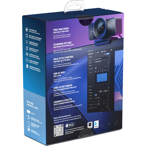 With a 1/1.8″ Sony STARVIS 2 CMOS sensor, the Facecam 4K Studio ensures that you can be seen clearly in low-light conditions. A 90° field of view allows viewers to see your background as you present. Add separately purchased lens filters to change the mood and visual style of your videos. With its compact design, the Facecam 4K rests easily on your laptop screen or monitor. There is also a 1/4″ threaded mount that allows you to use a tripod. Simply connect the integrated USB-C cable to a compatible computer to get started. Then download the free Elgato Camera Hub desktop app to configure settings such as color, background effects, and virtual PTZ controls.